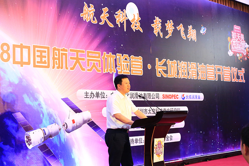 中国石化润滑油有限公司党委书记苟连杰致辞,宣布长城润滑油中国航天员体验营正式启动,感恩所有航天员与工作人员对航天员体验营的支持与配合,鼓励现场每一位拥有航天梦想的小营员们去勇敢追梦、实现梦想。苟书记表示,正是这群孩子们纯净的眼神和对航天知识的渴望之情深深的感染了我们。举办航天员体验活动的目的,一方面是让青少年学到更多的航天知识,给山区青少年们创造一个实现 “太空梦”的入口,为小营员们扮演一次‘助梦者’的角色。另一方面也希望航天知识在全社会得到普及,能够让更多贫困地区的孩子有机会实现航天梦想。